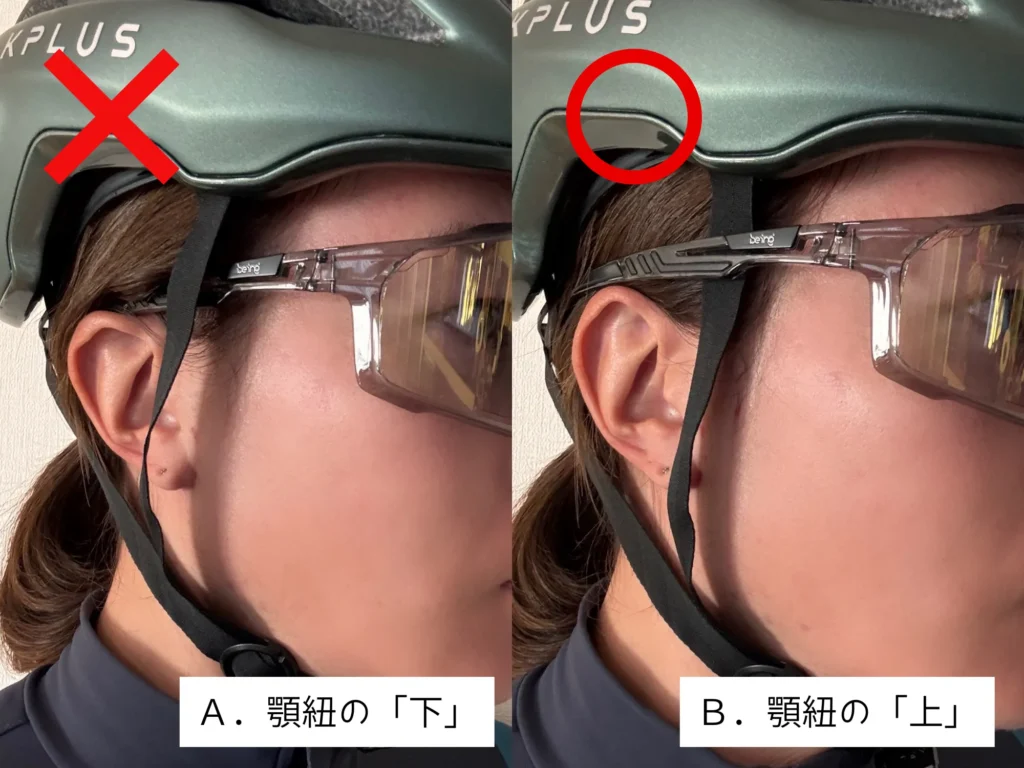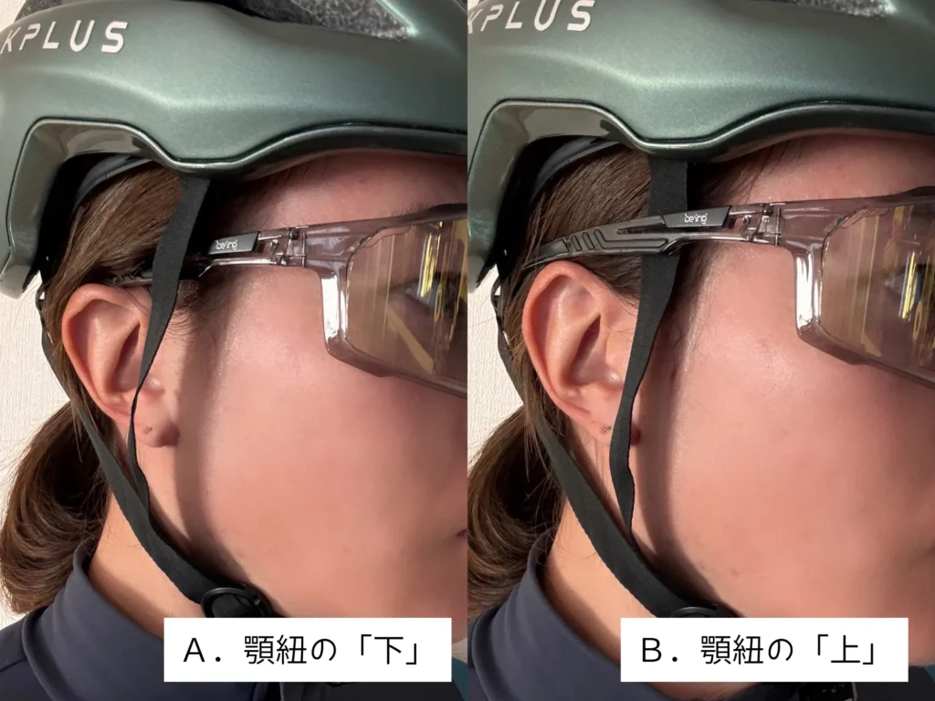 ヘルメットの顎紐とサングラスのテンプル(アーム)の位置関係に注目していただけると分かりやすいです。