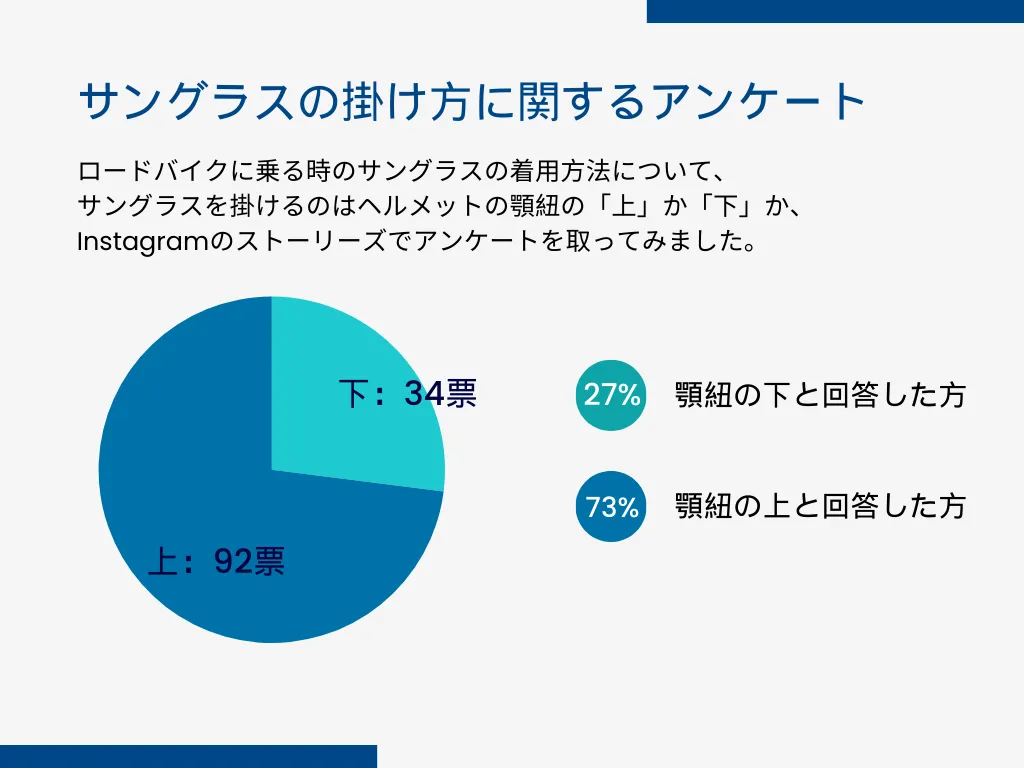 顎紐の「上」につける方が92票と全体の7割以上を占める結果となりましたが、